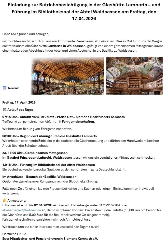 Betriebsbesichtigung der Glashütte Lamberts in Waldsassen und Führung im Bibliotheksaal der Abtei Waldsassen.